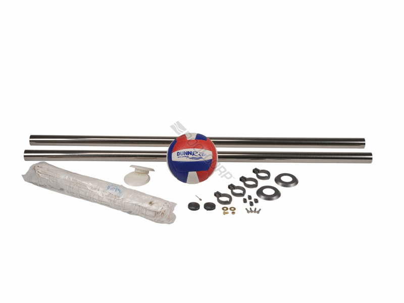 Dunn-Rite Products Inc., Stainless DeckVolley, Regulation Pool Volleyball Set ; Includes: (2) 60" x 1.90 dia. Stainless Steel Posts with Escutcheon Rings, Anchor Covers, red/white/blue colored Volleyball, Brass & Steel Hardware, & 24' heavy duty Net with Shortening Kit, Compatability: fits existing 1.90 anchors, Adjustable Height: up to 54" above deck, Warranty: 3 Year